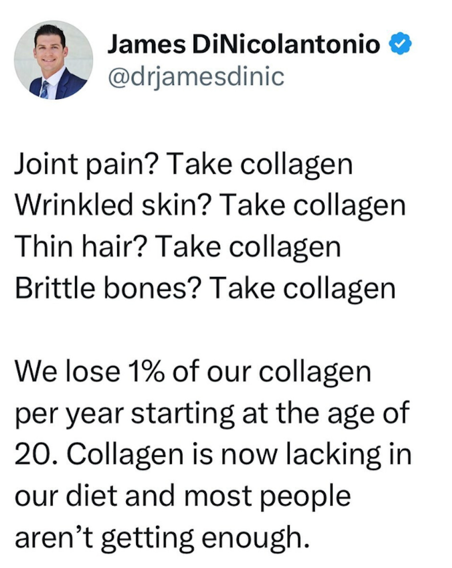 • Increased Risk of Injury: A lack of collagen means lower connective tissue integrity, leading to weaker joints and their surrounding tissues. These tissues are vital for structure and support putting you at a higher risk of tears, strains, sprains, osteoarthritis and tendinopathy.